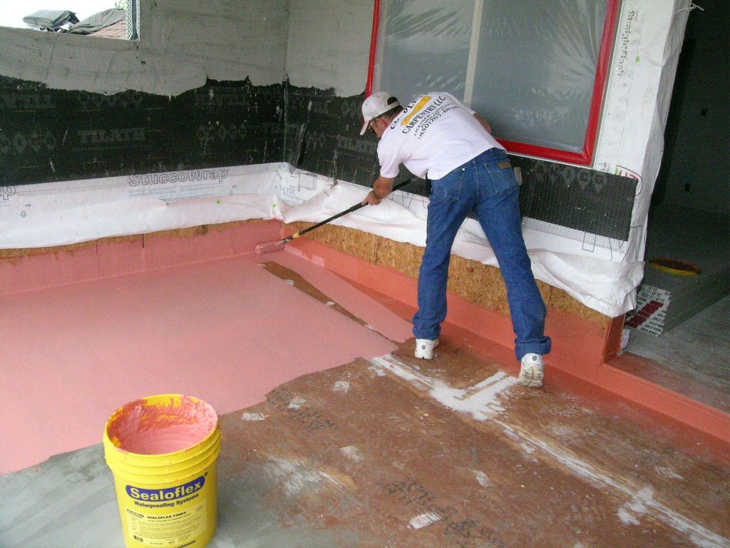 Elevated decks are a vulnerable place on any building, particularly at the wall joints. Darin is applying a rubberized coating to cloth flashing tape which goes up the wall and behind the drain wrap. This is where you have to slow down and do it right otherwise there will be water intrusion, extensive damage, and expensive repairs down the road.