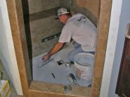 Darin layes in the shower floor. Note the travertine door jam pieces in the foreground. These are much better looking that regular tile. The joints are tighter and they can be made to look like one solid piece of natural stone.