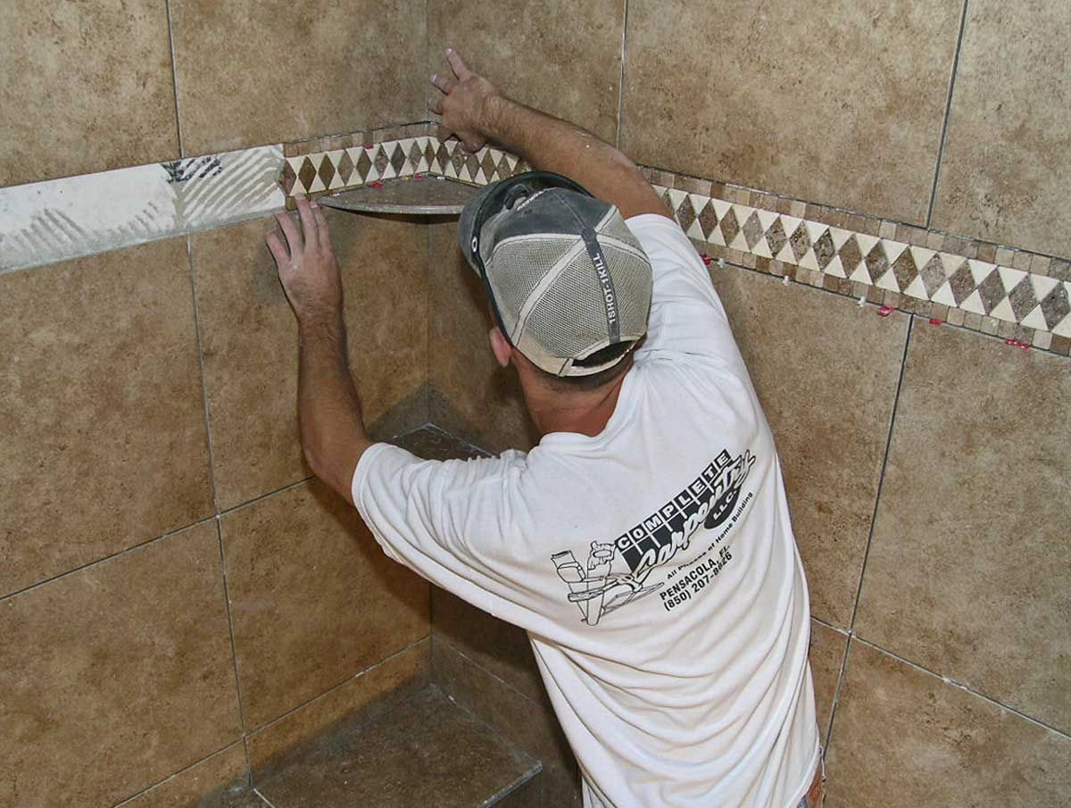 Darin installs a soap dish. Note the duorock behind the tile which has been sealed with green aquaseal to ensure a complete water tight enclosure.