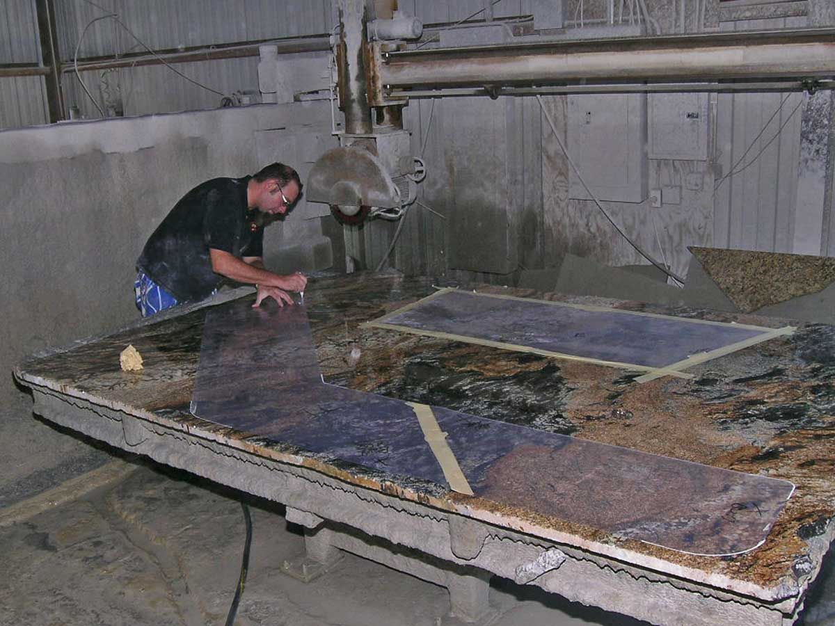 Jason makes the cuts with a diamond wet saw along the edges of the templates. The table rotates to position the slab for each cut. There aren't many places you can go to work in your bathing suit and flip flops. This is one of them.
