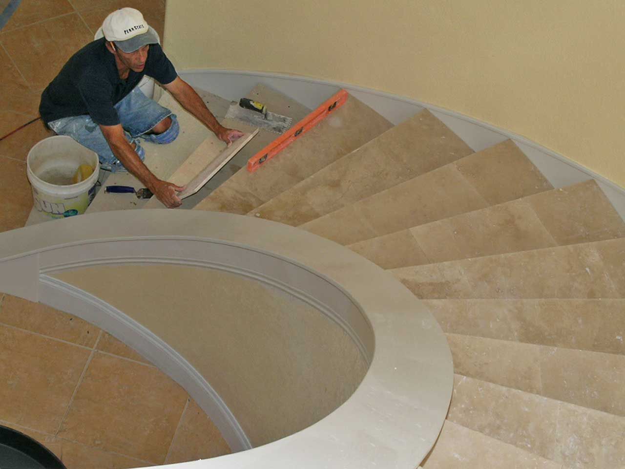 David lays in travertine tile pieces on the curved stair case. Travertine is a great material to use on stair cases because it can easily be cut, shaped, and polished to fit odd shapes. It can be laid with tight joints so as to appear to be solid stone.
