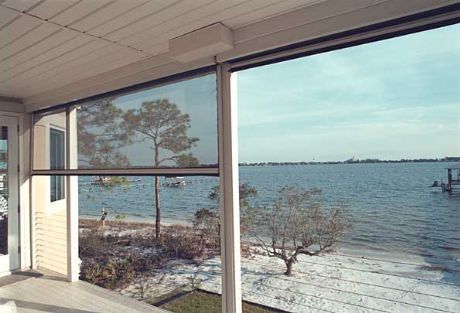 Motorized screens roll up for a better view. Note the wire rope railing. You can barely see it!