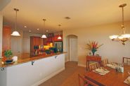 View from kitchen looking into dining room with view of east bay. Granite tops by Classic Design.