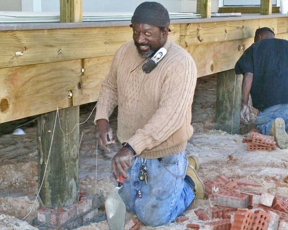 Tyrone laying the brick piers around the pilings. You'd never know this is a piling home from the outside. Ivan washed away the original home. This one's not going anywhere.